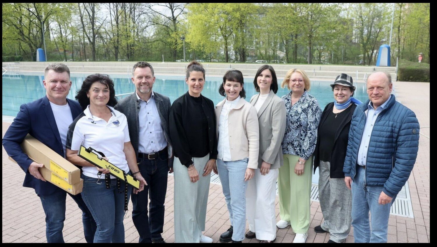 Gemeinsam für die Förderung des Schwimmunterrichts: Armin Köberl (Geschäftsführer des AK „Sport in Schule und Verein“), SC-53-Vorsitzende Christine Hauner-Stippler, Schulrat Christian Schießl, Sonja Becker (Sportreferentin der Regierung), die beiden Schwimmlehrerinnen Yvonne Klinger und Christina Meßmer, Eva Strasser (Leiterin des städtischen Schulverwaltungsamts), Stadtbad-Leiterin Jasmin Mineif und Stadtrat Hans-Peter Summer (CSU)