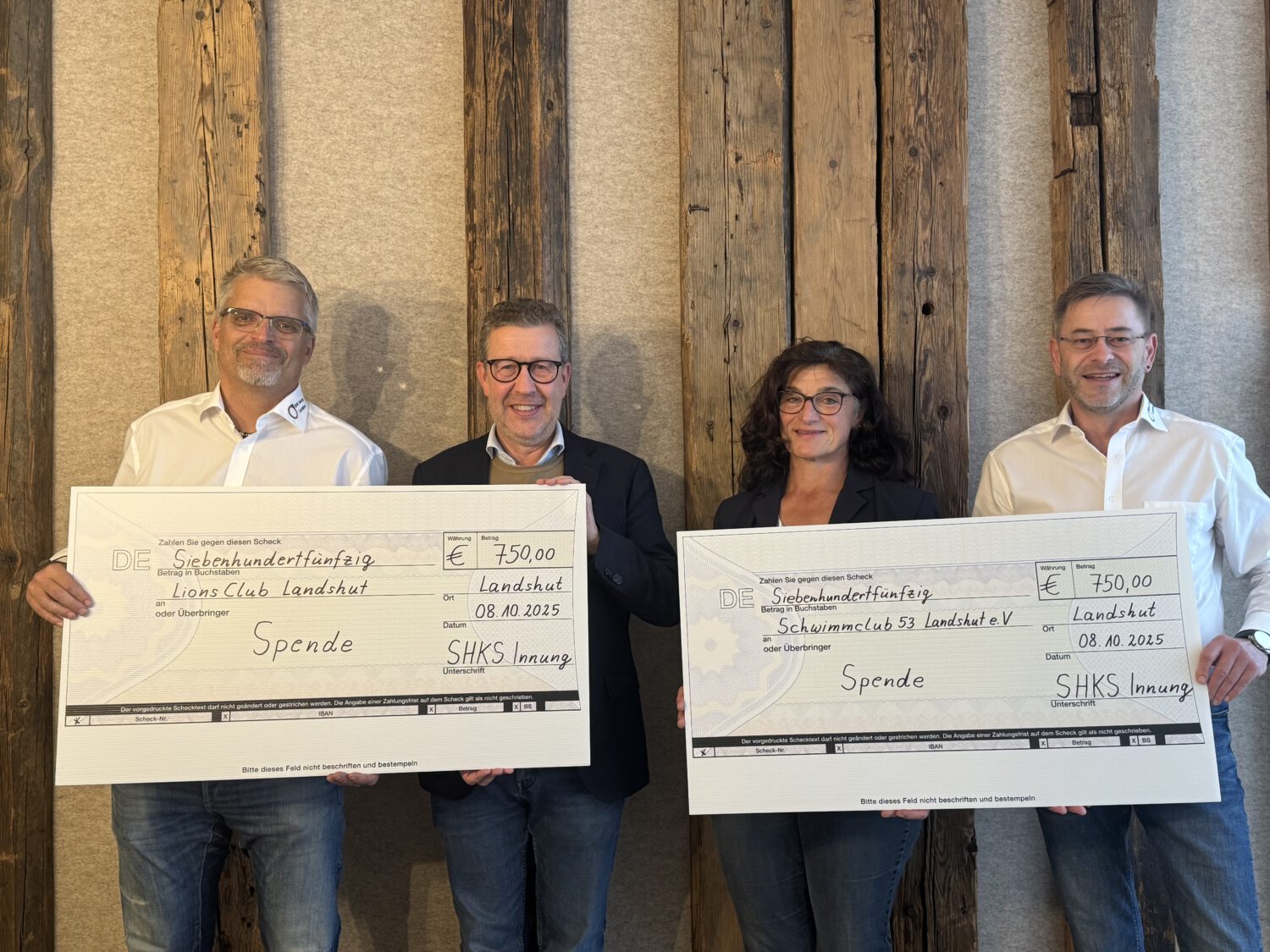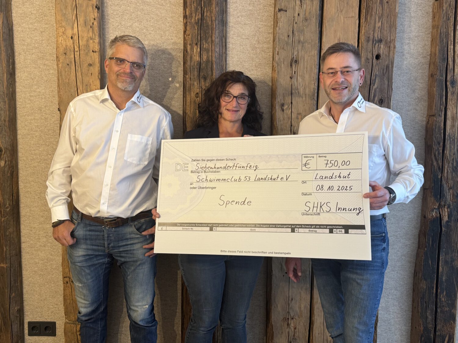 Im Rahmen eines Treffens mit der SHKS-Innung durften Herr Florian Schneider vom Lions Hilfswerk Landshut und Frau Hauner vom Schwimmclub SC53 jeweils einen Scheck in Höhe von 750,00 € entgegennehmen. Die Übergabe erfolgte durch Herrn Strasser und Herrn ……. Damit wurden die Spenden offiziell an die beiden Institutionen übergeben, die sich herzlich für die Unterstützung bedankten.